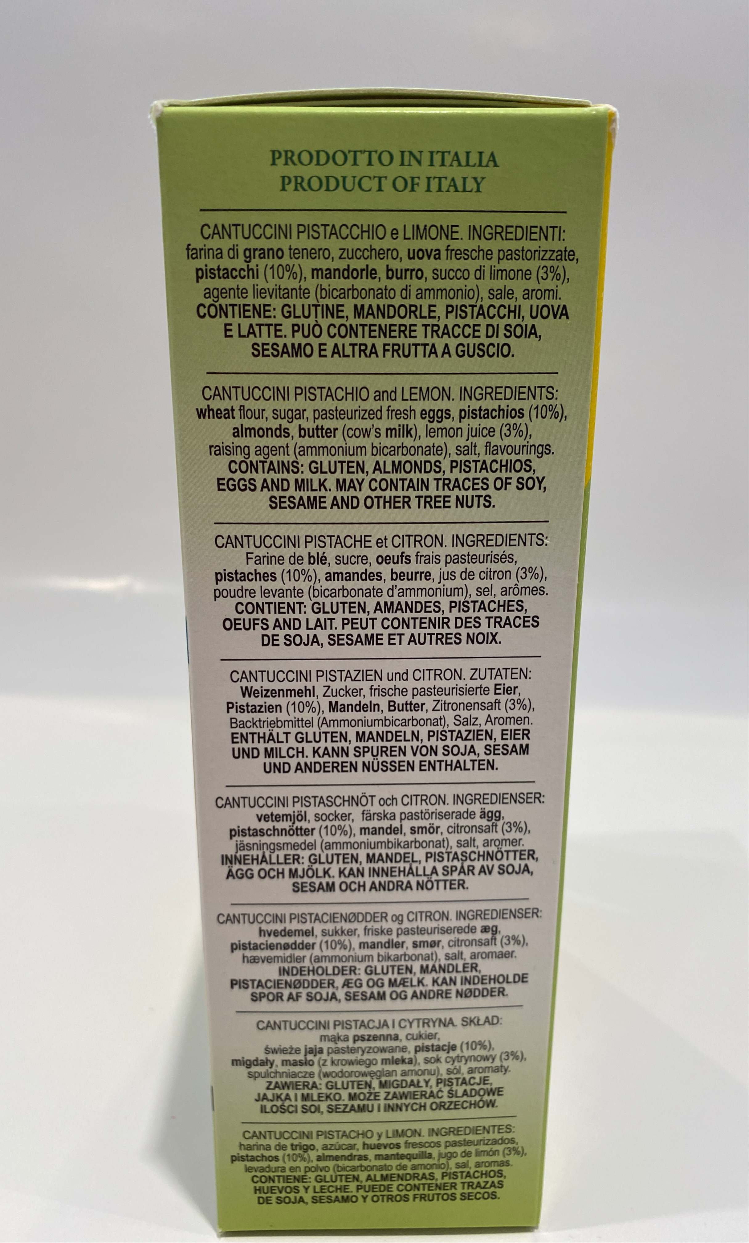 Combines two of the most popular flavors you'll find in Italy - pistacchio and lemon - in one terrific biscuit. Perfect with tea or coffee. Perfect size, not too small or big. Arrived fresh.